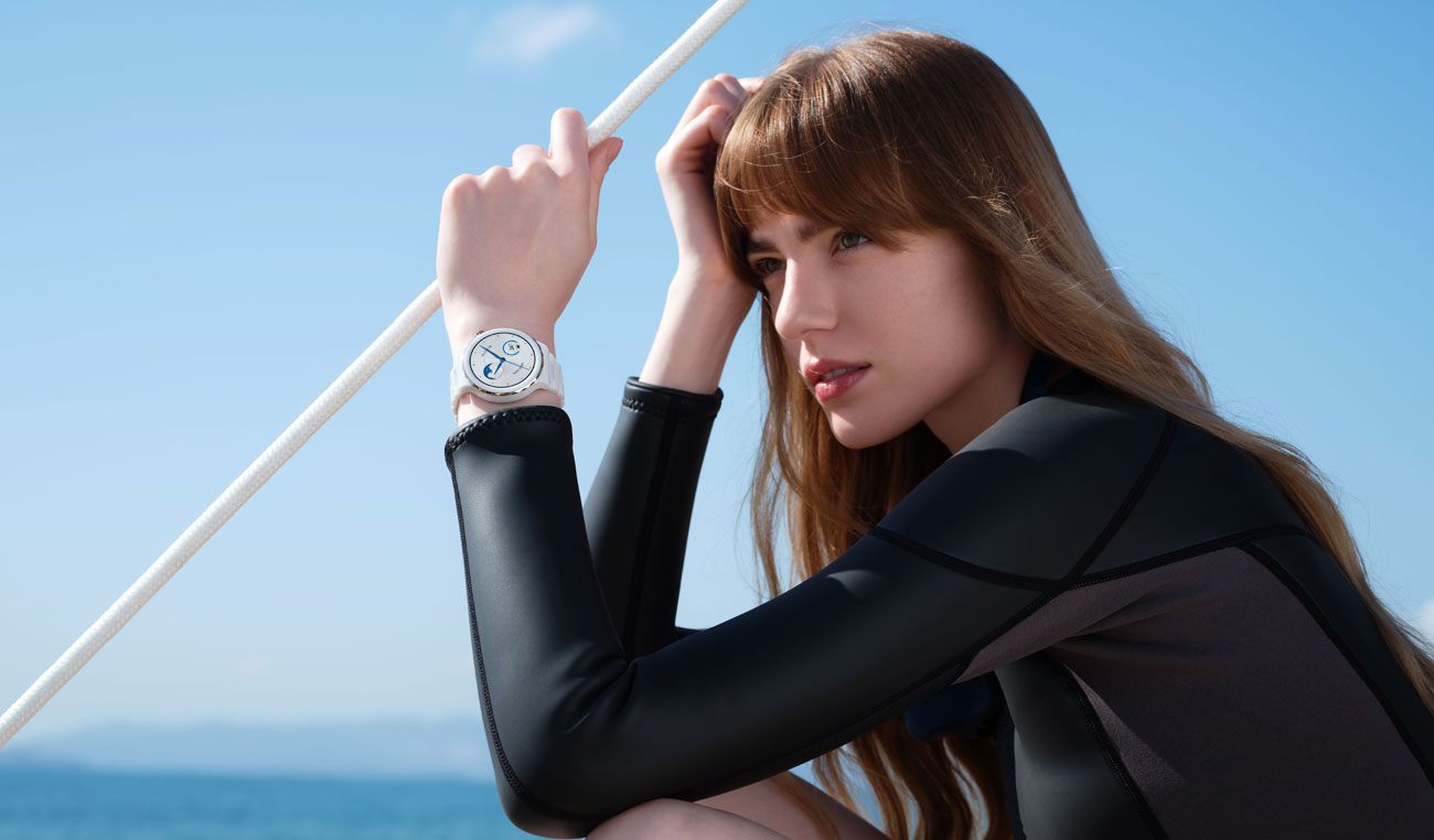 Eine geschnitzte Edelstahlkrone mit einer sphärischen Einlage aus Keramik auf einer Seite, die einen Hauch von stereoskopischer Eleganz verleiht. Hochgradig leitungsfähiges Saphirglas1 sorgt für noch genauere Messergebnisse der Hochpräzisionssensoren. Die Integration in das Keramikmaterial stellt ein passgenaues und komfortables Tragegefühl sicher. Ob mit einer Lünette in Hellgold mit weißem Keramikarmband oder einer Lünette in Silber mit weißem Lederarmband2 – beide Varianten setzen einen entscheidenden Akzent mit zeitlosem Charme.