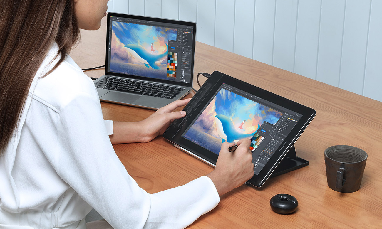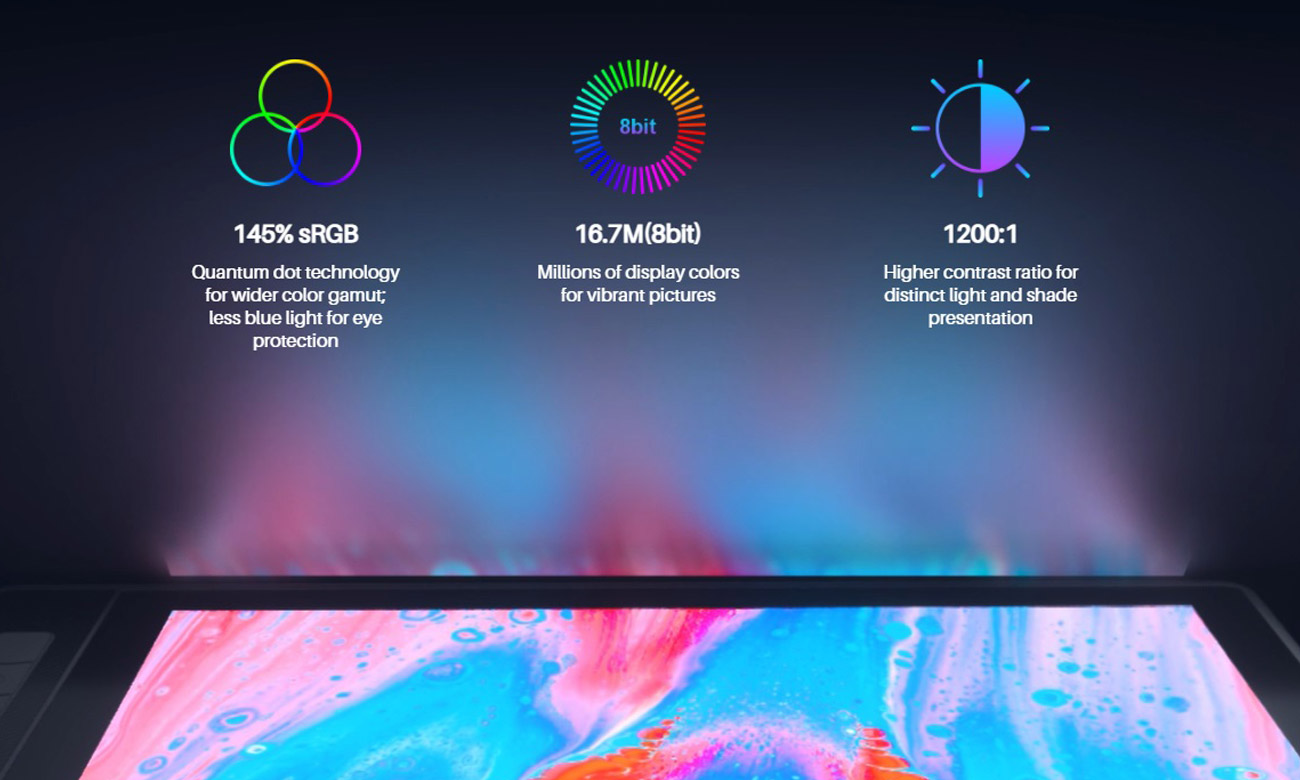 Das Kamvas Pro 13 2.5K erreicht 145% der sRGB-Farbskala dank Quantum-Dot-Technologie. In Kombination mit einem optimierten Kontrastverhältnis von 1200:1 kann das Tablet Bilder mit hoher Sättigung anzeigen. Es bietet auch eine präzise Farbwiedergabe und natürliche Helligkeit.