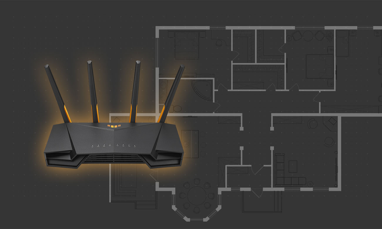 Der Router TUF Gaming AX3000 V2 wurde entwickelt, um eine maximale WLAN-Reichweite zu gewährleisten. Er nutzt OFDMA, eine neue Technologie, die vom Wi-Fi-6-Standard bereitgestellt wird und ein weiteres Übertragen des Signals ermöglicht als bei Wi-Fi 5. Durch die 2x2-MIMO-Konfiguration sowie andere Verbesserungen wie Beamforming, das das Signal in Richtung einzelner Geräte konzentriert, bietet der TUF Gaming AX3000 V2 ein Signal in jeden Winkel des Hauses. Und wenn du einen größeren Bereich oder neue Funktionen benötigst, kannst du jederzeit einfach einen weiteren kompatiblen Router zu deinem AiMesh-Netzwerk hinzufügen.