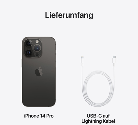 2Das Display hat gerundete Ecken. Als Rechteck gemessen hat das Display eine Diagonale von 6,12" (15,54 cm). Der tatsächlich sichtbare Displaybereich ist kleiner. 3Die Batterielaufzeit variiert abhängig von Verwendung und Konfiguration. Weitere Infos unter apple.com/de/batteries. 4Datentarif erforderlich. 5G ist in ausgewählten Ländern und über ausgewählte Anbieter verfügbar. Die Geschwindigkeit kann je nach Standort und Anbieter variieren. Nähere Informationen zur 5G Unterstützung gibt es beim jeweiligen Mobilfunkanbieter und auf apple.com/de/iphone/cellular. 5Das iPhone 14 Pro ist vor Wasser und Staub geschützt und wurde unter kontrollierten Laborbedingungen getestet. Es ist nach IEC Norm 60529 unter IP68 klassifiziert (bis zu 6 Meter für bis zu 30 Minuten). Der Schutz vor Wasser und Staub ist nicht dauerhaft und kann mit der Zeit als Resultat von normaler Abnutzung geringer werden. Ein nasses iPhone darf nicht geladen werden. Im Benutzerhandbuch befindet sich eine Anleitung zum Reinigen und Trocknen. Die Garantie deckt keine Schäden durch Flüssigkeitenab. 6Einige Features sind u.U. nicht in allen Ländern oder Regionen verfügbar.
