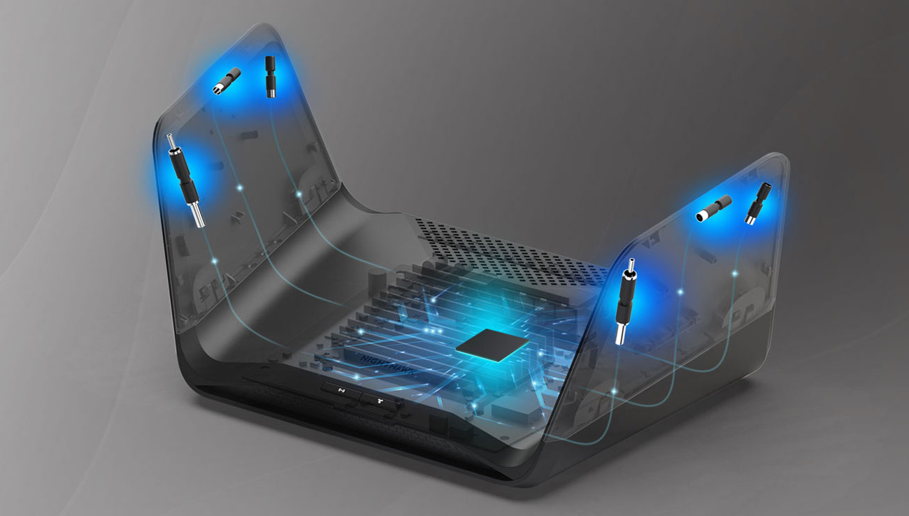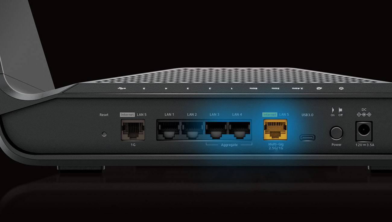 Der Netgear Nighthawk RAXE300 bietet eine patentierte Wi-Fi-Optimierung und sechs optimal platzierte Antennen, um eine höhere Kapazität, stärkere und zuverlässigere Verbindungen sowie weniger Störungen für verbundene Geräte zu gewährleisten. Nutze den 2,5G-Ethernet-Port oder die Aggregation von zwei Gigabit-LAN-Anschlüssen für Geschwindigkeiten von bis zu 2 Gb/s, um Gigabit+-Geschwindigkeiten an anspruchsvolle Geräte zu liefern. Schließe noch mehr kabelgebundene Geräte an die vier zusätzlichen Gigabit Ethernet-Ports des Netgear Nighthawk RAXE300 an.