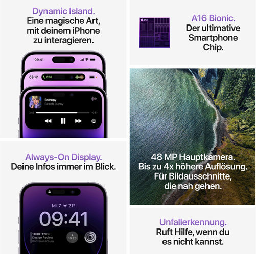 2Das Display hat gerundete Ecken. Als Rechteck gemessen hat das Display eine Diagonale von 6,69" (17 cm). Der tatsächlich sichtbare Displaybereich ist kleiner. 3Die Batterielaufzeit variiert abhängig von Verwendung und Konfiguration. Weitere Infos unter apple.com/de/batteries. 4Datentarif erforderlich. 5G ist in ausgewählten Ländern und über ausgewählte Anbieter verfügbar. Die Geschwindigkeit kann je nach Standort und Anbieter variieren. Nähere Informationen zur 5G Unterstützung gibt es beim jeweiligen Mobilfunkanbieter und auf apple.com/de/iphone/cellular. 5Das iPhone 14 Pro Max ist vor Wasser und Staub geschützt und wurde unter kontrollierten Laborbedingungen getestet. Es ist nach IEC Norm 60529 unter IP68 klassifiziert (bis zu 6 Meter für bis zu 30 Minuten). Der Schutz vor Wasser und Staub ist nicht dauerhaft und kann mit der Zeit als Resultat von normaler Abnutzung geringer werden. Ein nasses iPhone darf nicht geladen werden. Im Benutzerhandbuch befindet sich eine Anleitung zum Reinigen und Trocknen. Die Garantie deckt keine Schäden durch Flüssigkeitenab. 6Einige Features sind u.U. nicht in allen Ländern oder Regionen verfügbar.