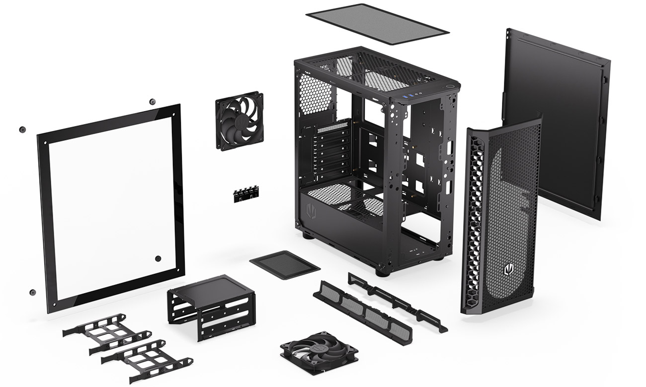 Bauen Sie ein leistungsfähiges System im ENDORFY Signum 300 Core Gehäuse. Es ist kompatibel mit ATX-, microATX- und ITX-Motherboards. Es passt auch Grafikkarten mit einer Länge von bis zu 350 mm und verfügt über 8 Erweiterungsslots. Darüber hinaus hat der Hersteller Platz für einen CPU-Kühler mit einer Höhe von bis zu 161 mm vorgesehen. Das Signum 300 Core kann problemlos vier 2,5"-Laufwerke oder zwei 2,5"- und zwei 3,5"-Laufwerke aufnehmen. Sie können auch ein Netzteil bis zu 180 mm einbauen.