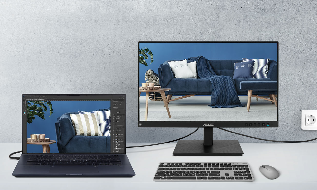 Schließe Geräte bequem an den ASUS BE24ECSBT-Monitor an. Der beiliegende USB-C-Port ermöglicht superschnelle Datenübertragung. Zusätzlich bietet der Monitor HDMI-Eingang und -Ausgang, DisplayPort sowie drei USB 3.2 Gen1 Typ-A-Ports. Dadurch ist er mit einer breiten Palette von Geräten kompatibel. Es gibt auch einen Durchgangsport für den Kopfhörereingang. Mit dieser Konnektivität kannst du alles anschließen, was du brauchst.