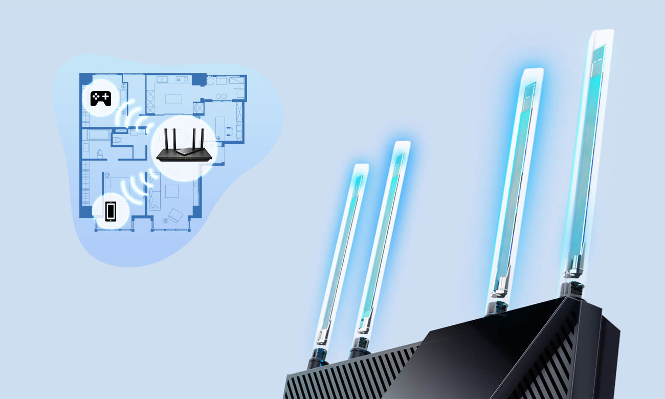 Nutze schnelle Verbindungen mit geringer Latenz, auch bei hoher Netzwerkauslastung, dank des leistungsstarken Qualcomm-Prozessors und des schnellen Speichers. Jeder Klick auf einer Webseite und jede Aktion beim Online-Gaming erfolgen deutlich schneller. Spielen, Videos ansehen und Arbeiten sind gleichzeitig möglich. Die OFDMA-Technologie verbessert das WLAN, indem sie es vielen Geräten ermöglicht, gleichzeitig denselben Kanal zu nutzen. Vier externe Hochleistungsantennen in Kombination mit Beamforming-Technologie bieten einen zuverlässigen drahtlosen Netzwerkzugang im gesamten Haus sowie reibungslose und stabile Verbindungen für alle Benutzer.