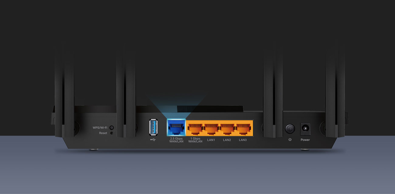 Zusätzlich zu den Wi-Fi-6-Geschwindigkeiten bietet der Archer AX55 Pro auch sehr schnelle kabelgebundene Verbindungen. Der 2,5-Gigabit-Port und der 1-Gigabit-Port können die Gigabit-Geschwindigkeiten deines Internetdienstanbieters voll ausnutzen. Überwinde das 1-Gigabit-Limit und sorge dafür, dass deine Geräte mit höchster Leistung arbeiten können. Die Unterstützung von WAN/LAN-Ports gibt dir die Möglichkeit, sie entsprechend den Anforderungen deines Netzwerks optimal zu nutzen. Teile Dateien ganz einfach zwischen verbundenen Geräten, indem du eine externe Festplatte an den USB-3.0-Port anschließt. Du kannst sogar deinen persönlichen Cloud-Speicher einrichten und sicher von außerhalb darauf zugreifen.