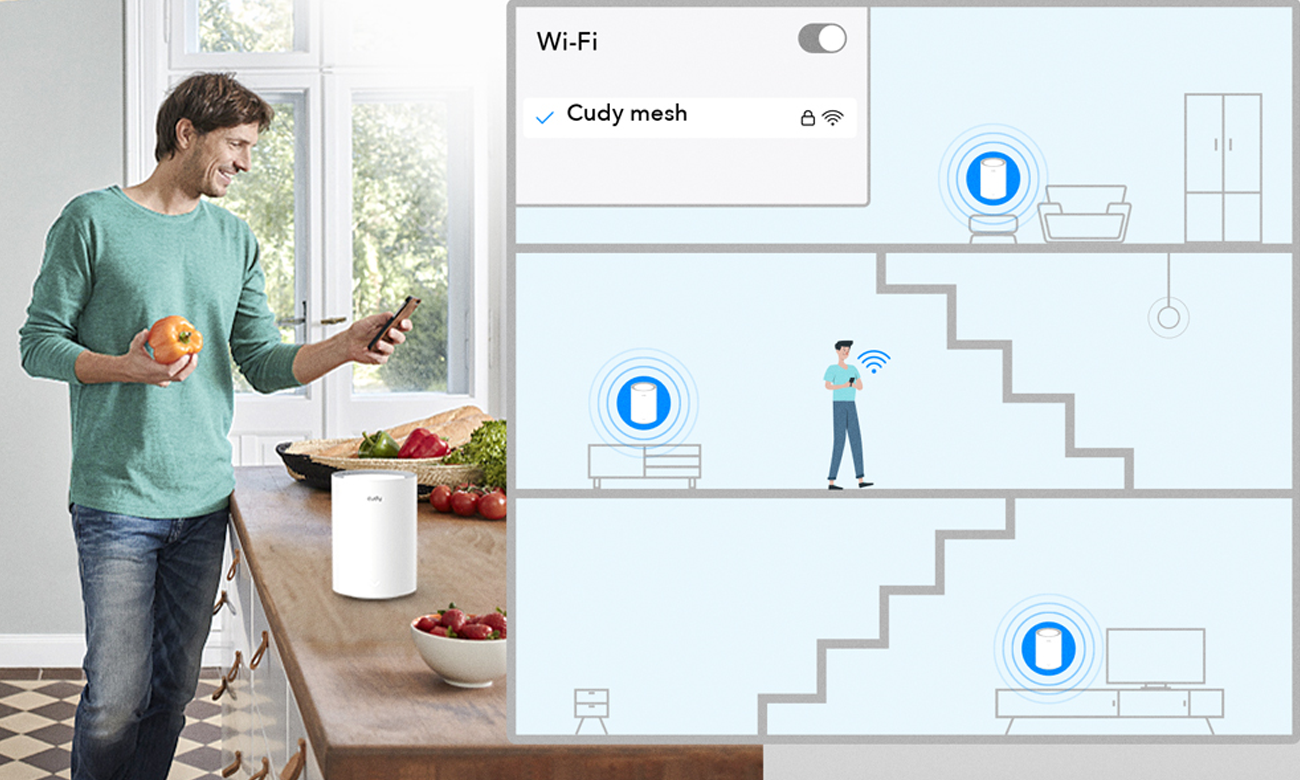 Mit dem Cudy M1800 Router kannst du deinen Mitbewohnern eine reibungslose WLAN-Verbindung bieten. Du kannst bis zu 100 Geräte damit verbinden. Dadurch kannst du problemlos dein Zuhause überwachen, Dateien herunterladen oder Smart-Home-Geräte nutzen. Außerdem, wenn du mehrere M1800 Geräte verwendest, erhöhst du die Reichweite des WLAN-Netzwerks. Dadurch vermeidest du Bereiche mit schwacher oder gar keiner Verbindung.