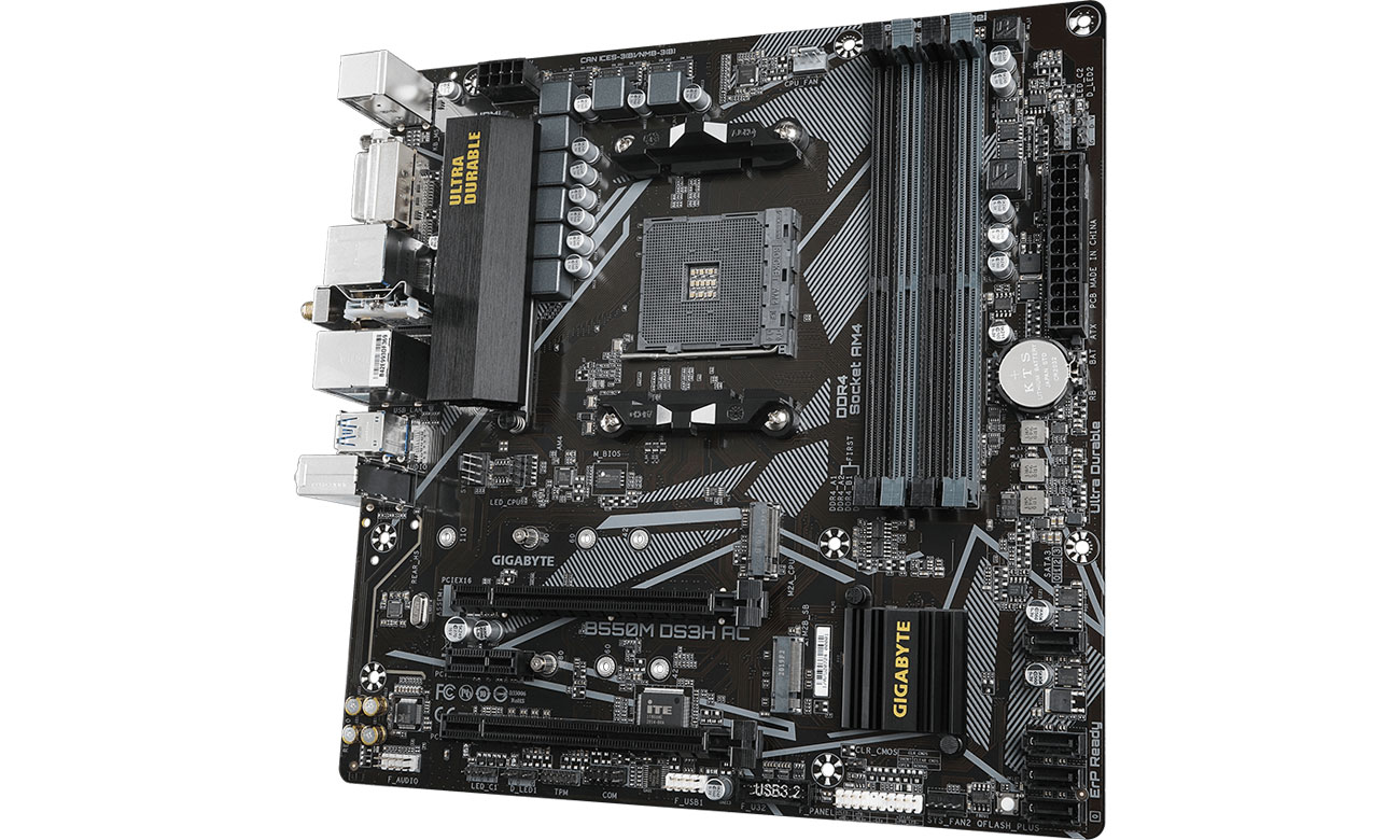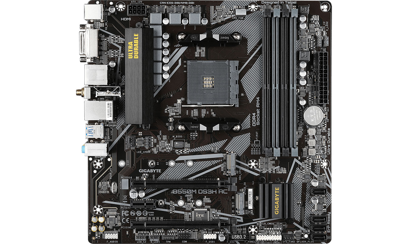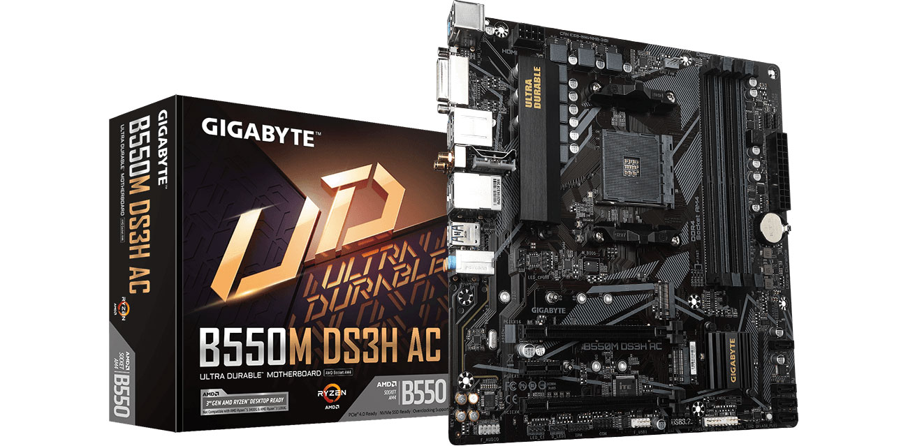 Spiele und arbeite mit der hohen Leistung von AMD-Prozessoren und dem Gigabyte B550M DS3H AC Mainboard. Der AM4-Socket unterstützt Prozessoren der Serien 5000/4000/3000, und dank der DVI- sowie HDMI-Ausgänge kannst du die im CPU integrierten Grafikeinheiten nutzen. Zuverlässige Lösungen, bekannt aus der Ultra Durable Serie, bieten dir stabile Leistung in jeder Situation. Dabei kannst du schnelle M.2 SSDs anschließen sowie dich über LAN oder Wi-Fi mit dem Netzwerk verbinden. Zahlreiche Kühlungsoptionen geben dir die Kontrolle über die Belüftung des gesamten Gehäuses. Das Gigabyte B550M DS3H AC Mainboard verspricht dir hohe Soundqualität dank des mehrkanaligen Realtek Codecs. Unterstützt durch Premiumkomponenten wie Audio-Kondensatoren. Ein spezieller Pfad auf dem PCB trennt das Audiosystem von anderen Mainboardkomponenten. Dies schützt die empfindlichen analogen Signale vor Interferenzen.