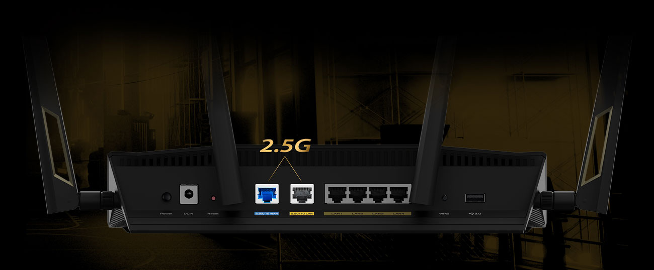 Im ASUS RT-AX88U Pro Router findest du zwei WAN/LAN-Ethernet-Ports mit einer maximalen Durchsatzrate von 2,5 Gb/s. Sie unterstützen Link-Aggregation und Lastausgleich, was Flexibilität und die Möglichkeit bietet, das volle Potenzial deiner Verbindung auszuschöpfen. Schließe den 2,5-Gb/s WAN-Port und den 1-Gb/s WAN-Port an ein kompatibles Gerät deines Anbieters an, um eine Bandbreite von bis zu 3,5 Gb/s zu erhalten. Oder verbinde zwei Gigabit-LAN-Ports mit einem kompatiblen Computer, um die Bandbreite auf 2 Gb/s zu verdoppeln.
