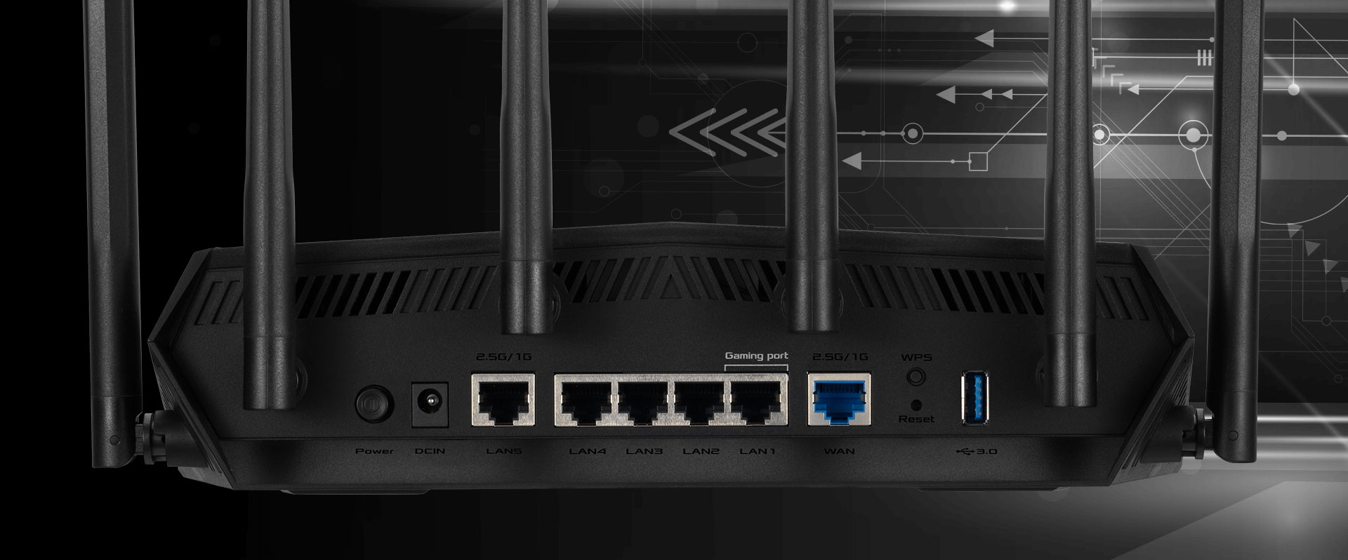 Mit dem ASUS TUF Gaming AX6000 kannst du das volle Potenzial deines Breitbandanschlusses nutzen. Wenn dein ISP-Gerät Anschlüsse mit einer Bandbreite von 2,5 Gb/s bietet, kannst du sie in den beiden WAN-Ports des TUF Gaming AX6000-Routers anschließen. Dadurch erhältst du eine verfügbare Geschwindigkeit von bis zu 5 Gb/s. Wenn du eine höhere Bandbreite zum Computer weiterleiten möchtest, reichen zwei Gigabit-LAN-Ports aus. Schließe sie an den ASUS-Router an, um durch die Aggregation der Verbindungen bis zu 2 Gb/s zu erhalten.