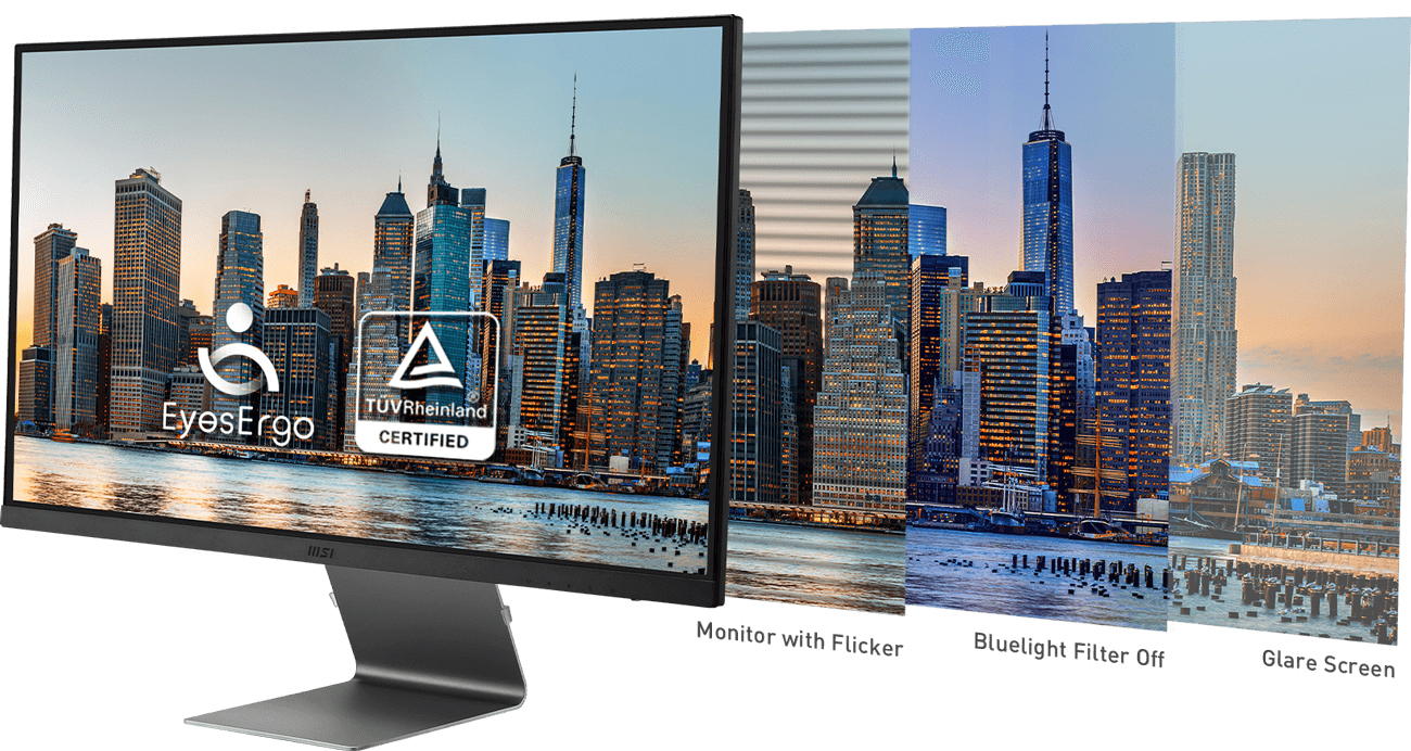 MSI hat das ErgoEyes Technologiepaket entwickelt, das mit dem Wohlbefinden des Benutzers im Sinn konzipiert wurde. Es umfasst von TÜV zertifizierte Technologien wie Anti-Flicker, Less Blue Light, ein blendfreies Panel und das Eye-Q Check System. Dadurch kannst du sicher sein, dass deine Augen gut geschützt sind.