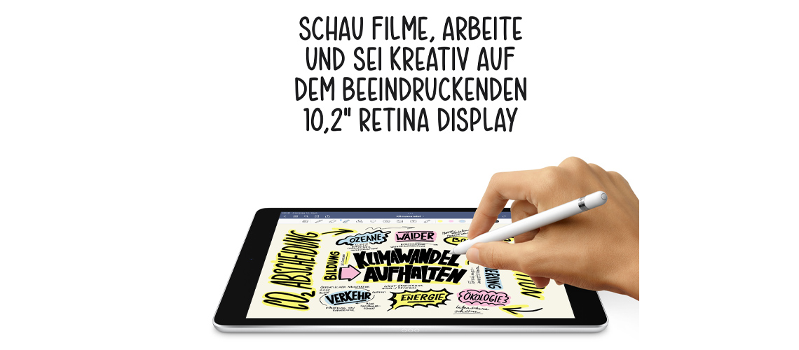 Viel Power. Leicht zu bedienen. Vielseitig. Das neue iPad hat ein beeindruckendes 10,2" Retina Display, den leistungsstarken A13 Bionic Chip, eine Ultraweitwinkel-Frontkamera mit Folgemodus und funktioniert mit dem Apple Pencil und dem Smart Keyboard.* Das iPad lässt dich noch mehr noch einfacher erledigen. Alles zu einem unglaublichen Preis.