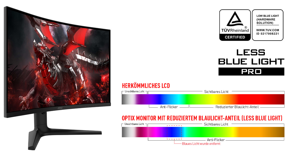 MSI Gaming Monitore sind darauf spezialisiert, deine Augen mithilfe der MSI Less-Blue-Light-Technik bei langer Nutzung zu schonen. Somit kannst du ungestört auch längere Gaming-Sessions genießen.