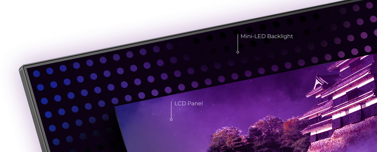 Dank der Mini-LED-Technologie kombiniert dieses Modell Helligkeit, höchste Bildqualität und beste Bilduniformität, während es dünner als Monitore mit herkömmlicher LED-Hintergrundbeleuchtung bleibt. 50 Graustufen, die den Immersionseffekt beeinträchtigen, werden eliminiert, wodurch echtes Schwarz und ein reduzierter Halo-Effekt erreicht werden.