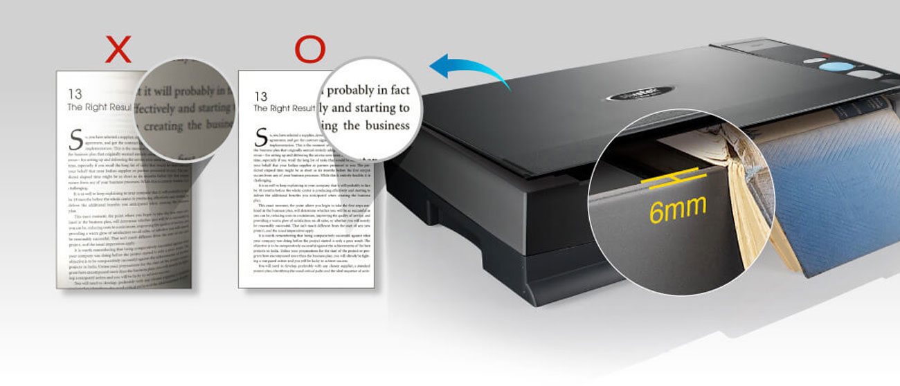 Die patentierte Plustek-Erfindung zur Schatteneliminierung (Shadow Elimination Element) beseitigt den Buchrückenschatten und die Textverzerrung, die beim Scannen von Büchern auf Flachbettscannern oder Kopierern auftreten. Die Plustek BookPavillion-Software bietet ein einfaches und effizientes Buchscannen. Speziell für das Scannen von Büchern entwickelt, minimiert es die Zeit, die für die Digitalisierung eines ganzen Buches oder mehrerer Kapitel benötigt wird, dank einer intuitiven Benutzeroberfläche und eines optimierten Scan-Workflows.