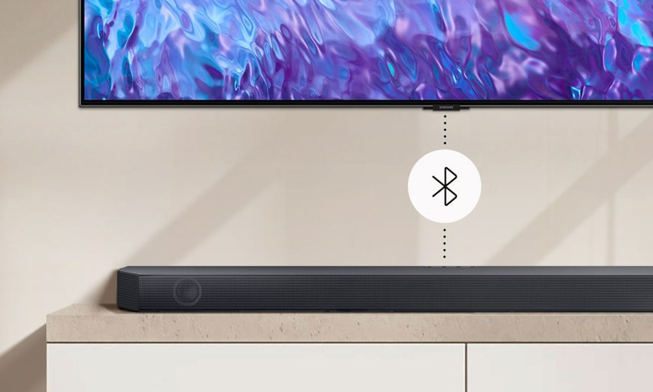 Verbinde die Soundbar mit dem Fernseher über Bluetooth® und genieße deine Lieblingsinhalte ohne unschöne Kabelsalat. Vergiss die vielen Fernbedienungen. Jetzt kannst du die Funktionen der Soundbar steuern, die Lautstärke regeln, die Soundbar ein- und ausschalten und die Klangeffekte mit einer einzigen Fernbedienung verwalten – derselben, mit der du deinen Samsung Fernseher bedienst.
