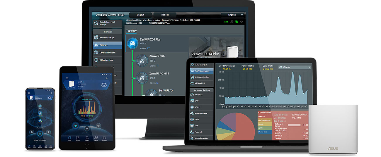 Jedes der ZenWiFi XD4 Plus-Geräte kann im Routermodus oder im AiMesh-Knotenmodus arbeiten, entweder als Repeater oder in Zusammenarbeit mit anderen ZenWi-Fi-Routern. Die Unterstützung des AiMesh-Standards ermöglicht es, das Netzwerk bei steigendem Bedarf einfach um weitere Geräte zu erweitern. Wenn du über eine Heimverkabelung mit Ethernet verfügst, kannst du die Leistung der ZenWiFi XD4 Plus-Geräte weiter verbessern. Nutze das LAN-Netzwerk, um die Netzwerkknoten miteinander zu verbinden und das volle Wi-Fi-Potenzial ausschließlich für Client-Geräte freizuschalten.