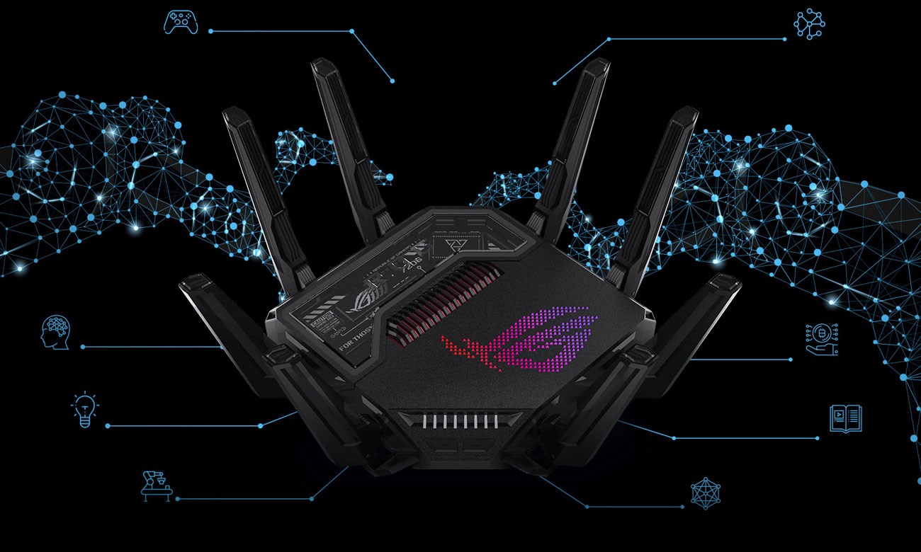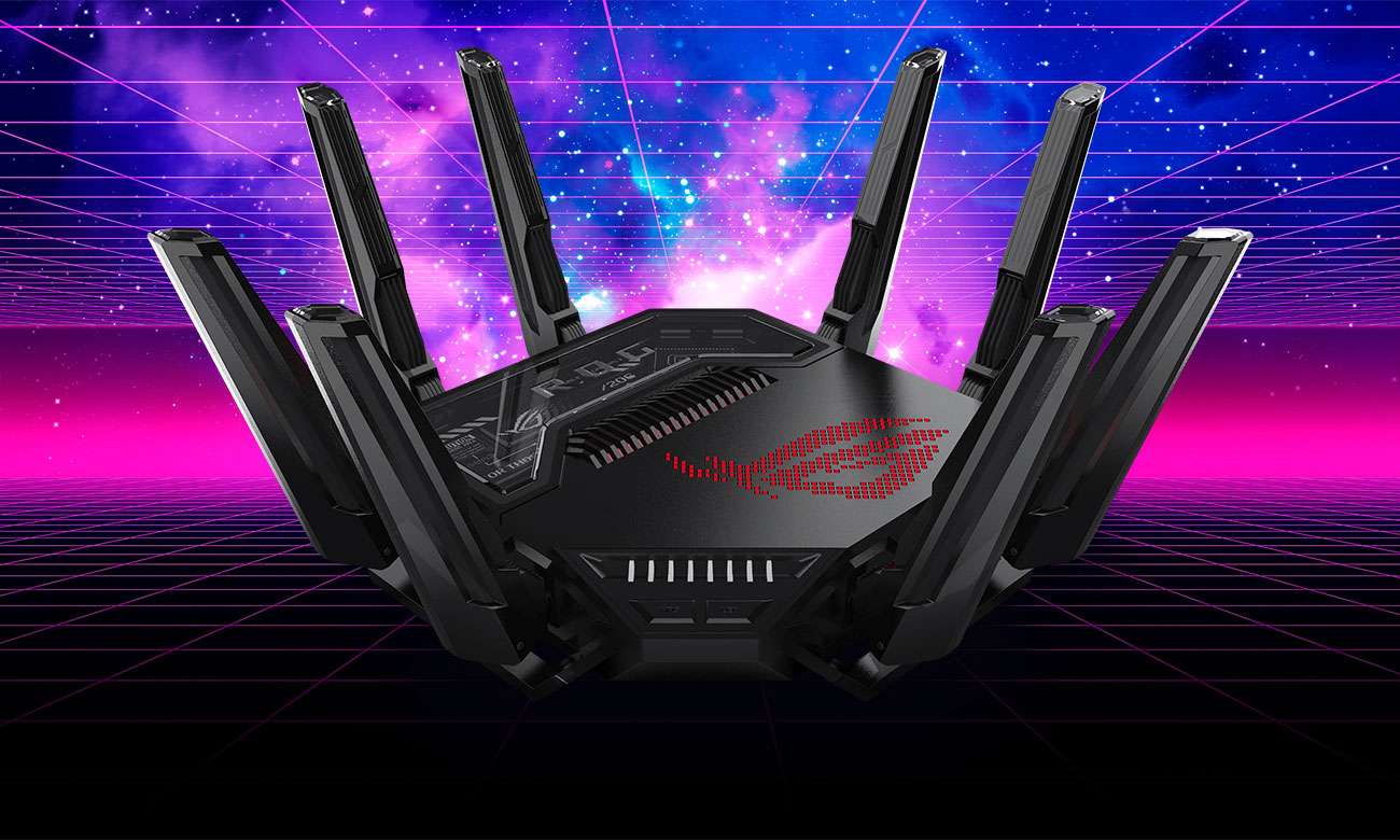 Der ASUS ROG Rapture GT-BE98 nutzt Wi-Fi 7 (802.11be), den neuen Standard für kabellose Kommunikation. Er übernimmt das Beste von Wi-Fi 6/6E und erweitert es um neue Möglichkeiten wie einen Kanal von 320 MHz und 4K-QAM-Modulation. Es führt auch Neuheiten wie MLO (Multi-Link Operation) ein, was es ermöglicht, den Router mit Geräten in mehreren Bändern (2,4/5/6 GHz) gleichzeitig zu verbinden. Die Kombination all dieser Lösungen ermöglicht ultraschnelle Geschwindigkeiten von bis zu 25 Gb/s, extrem niedrige Latenzzeiten und eine erhöhte Verbindungsstabilität. Spiele online auf einem völlig neuen Niveau, streame Inhalte in hoher Auflösung und lade große Dateien blitzschnell herunter.