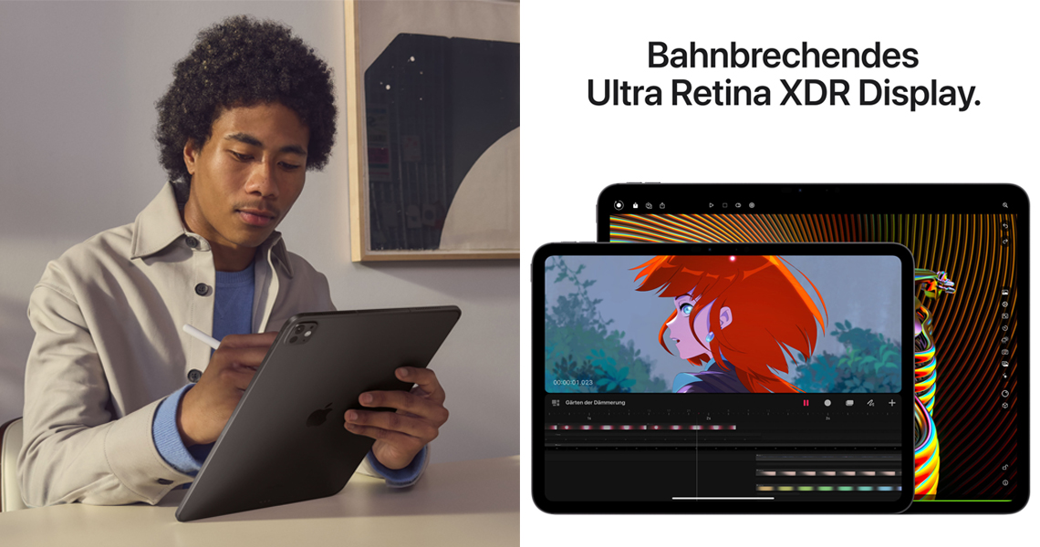 - 11" ULTRA RETINA XDR DISPLAY – Das Ultra Retina XDR liefert extreme Helligkeit und Kontrast, beeindruckende Farbgenauigkeit und kommt mit fortschrittlichen Technologien wie ProMotion, großem P3 Farbraum und True Tone.3 Außerdem gibt es eine Option mit Nanotexturglas bei den 1 TB und 2 TB Konfigurationen
