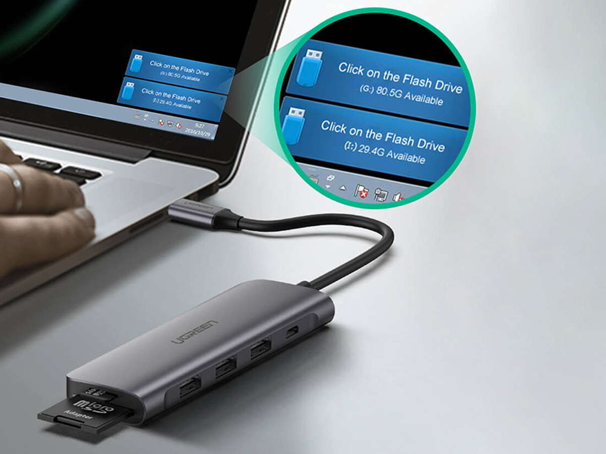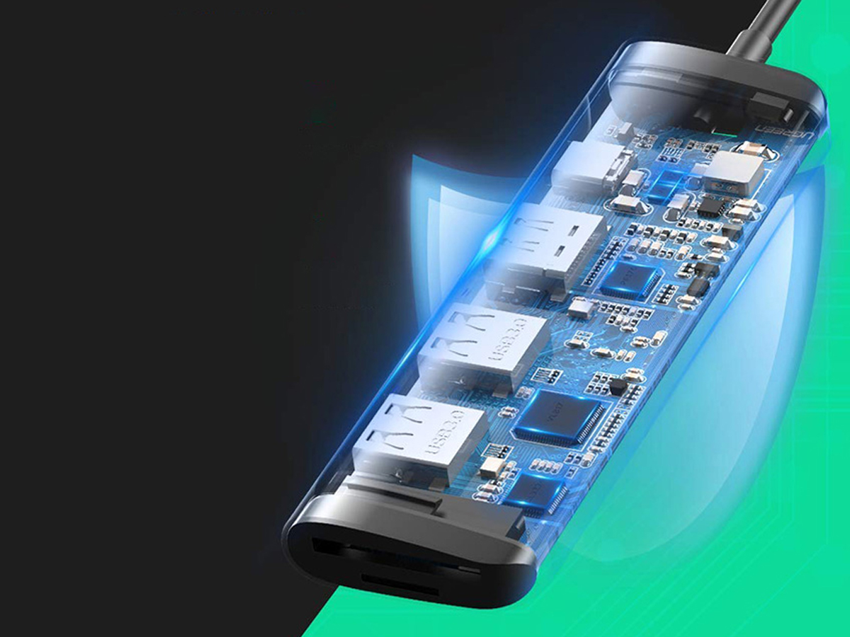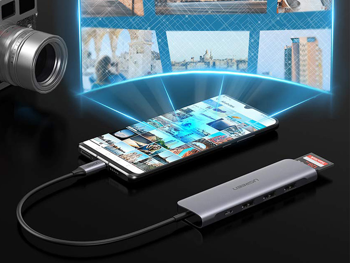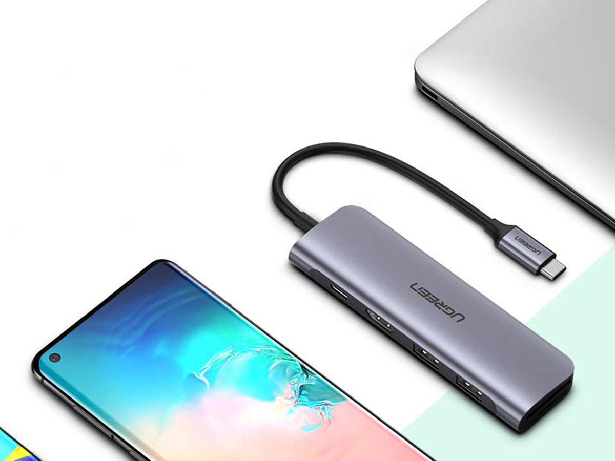 Erhöhen Sie die Funktionalität Ihres C-Ports mit dem UGREEN-Adapter. Das Gerät verfügt über 2 USB 3.0-Eingänge, einen PD-Port, einen 4K-HDMI-Eingang sowie SD- und microSD-Kartenleser.