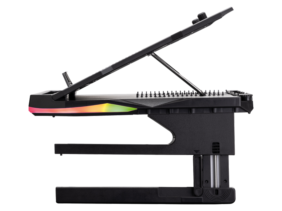 Schließen Sie den Portus X2 an einen USB-Anschluss an und erhalten Sie 6 verschiedene LED-Beleuchtungsmodi — viele Optionen, um die Umgebung an das Spiel anzupassen. Die Lüftungsschlitze im Ständer helfen, die Betriebstemperatur zu senken. Sie verbessern den Luftstrom und schützen den Laptop vor Überhitzung, die die Leistung einschränken oder Schäden verursachen kann.