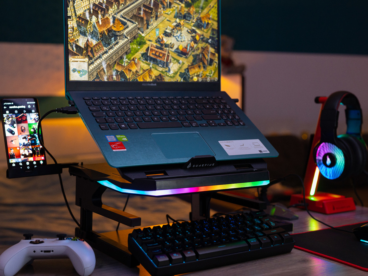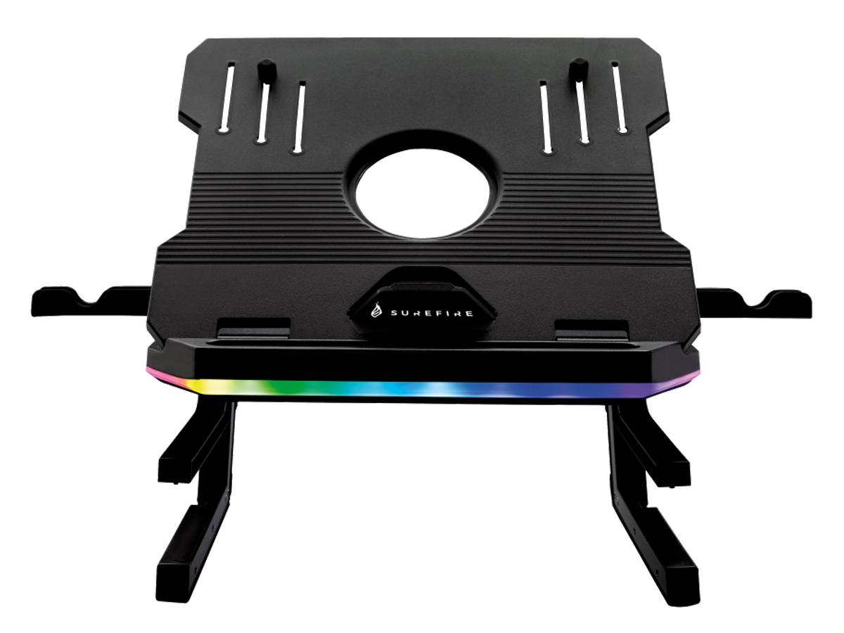 Der SureFire Portus X2 ist ein 3-stufiger Kühlständer mit RGB-Beleuchtung. Das Zubehör bietet 20 einstellbare Betrachtungswinkel, 3 Höhenstufen, 2 Telefonhalterungen und klappbare Beine. Dadurch stellt der Gaming-Laptop-Ständer Portus X2 alles dort auf, wo es benötigt wird, um ein optimales Spielerlebnis zu gewährleisten.