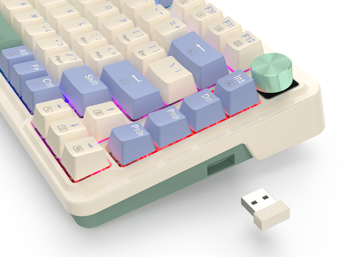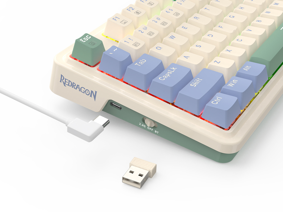 Praktische Lösungen umfassen einen seitlich angebrachten Anschluss für den Empfänger, der das Verlustrisiko des Adapters eliminiert. Die Tastatur verfügt auch über einen Drehknopf zur Steuerung von Multimedia-Funktionen. Die Hot-Swap-Funktion ermöglicht den schnellen Austausch der meisten 3- und 5-poligen Schalter. Diese Möglichkeit verleiht dem stilvollen Design dieser einzigartigen Tastatur noch mehr Praktikabilität. Entdecken Sie die Redragon K673CPG-RGB-PRO Ucal Pro und erleben Sie eine neue Dimension von Komfort und Funktionalität.