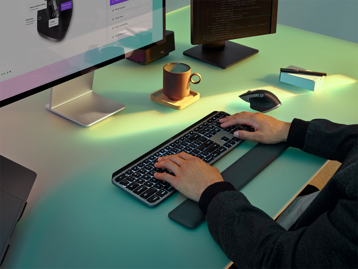 Die MX Keys S for Mac Tastatur ist ebenfalls mit intelligenter Beleuchtung ausgestattet. Sie schaltet sich ein, wenn sich Ihre Finger der Tastatur nähern. Darüber hinaus passt sie sich automatisch an die Tageszeit an, indem sie heller oder dunkler wird. Jetzt haben Sie mehr Kontrolle über die Helligkeit und die Dauer der Beleuchtung dank Logi Options+.