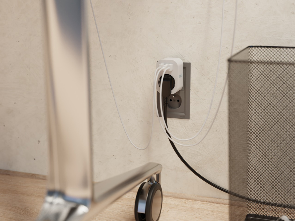 Dank der drei USB-Ports und einer herkömmlichen Steckdose können Sie gleichzeitig bis zu vier Geräte mit Strom versorgen. Die Leistung von 12 W reicht aus, um Mobiltelefone über Nacht zu laden, sowie für elektronische Geräte mit geringem Stromverbrauch wie Smartwatches und Bluetooth-Kopfhörer.