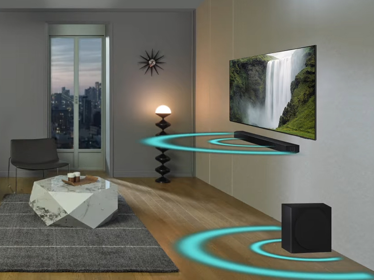 Erlebe harmonischen Klang durch die Zusammenarbeit von Fernseher- und Soundbar-Lautsprechern. Q-Symphony synchronisiert beide Geräte für maximale Klangsynergie. Mit künstlicher Intelligenz werden Klangobjekte optimiert, damit du jedes Detail intensiver wahrnimmst.