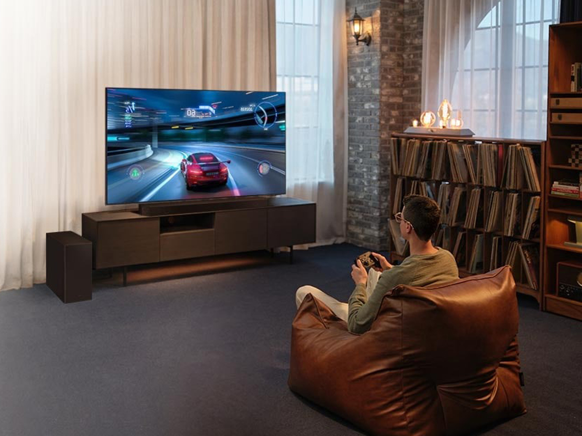 Erlebe optimierten Klang für Konsolenspiele dank leistungsstarker nach oben gerichteter Lautsprecher, Samsung Acoustic Beam Technologie und kräftigen Bässen. Der Soundbar synchronisiert sich automatisch mit deinem Fernseher und aktiviert den Game Mode Pro beim Einschalten deiner Konsole.