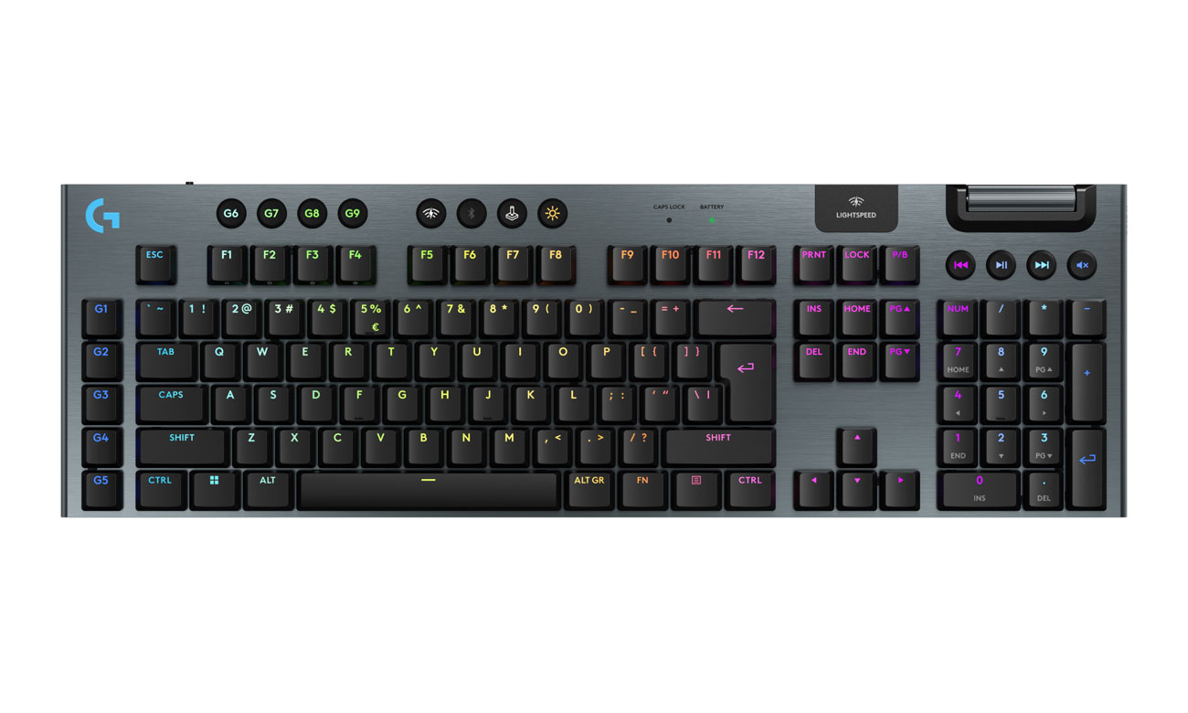 Die G915 X LIGHTSPEED ist eine kabellose Gaming-Tastatur, die fortschrittliche Technologie mit präziser Verarbeitung aus hochwertigen Materialien kombiniert. Sie bietet drei Verbindungsoptionen: kabelloses LIGHTSPEED 2,4 GHz, Bluetooth und kabelgebundenen Modus. Die KEYCONTROL-Funktion ermöglicht es, bis zu 15 Funktionen pro Taste zuzuweisen, und die flachen GL-Schalter beschleunigen die Reaktionen, sodass du eine höhere Anzahl von APM erreichen kannst.