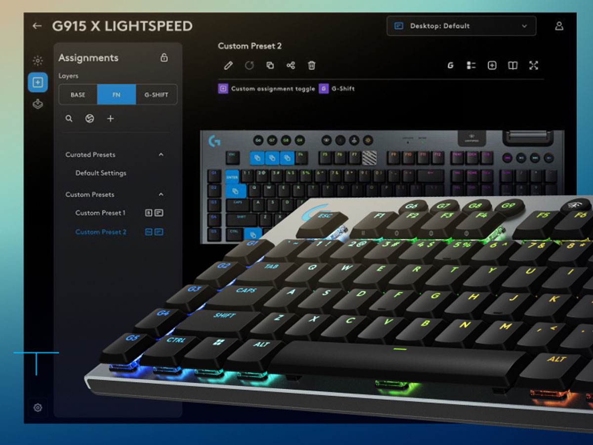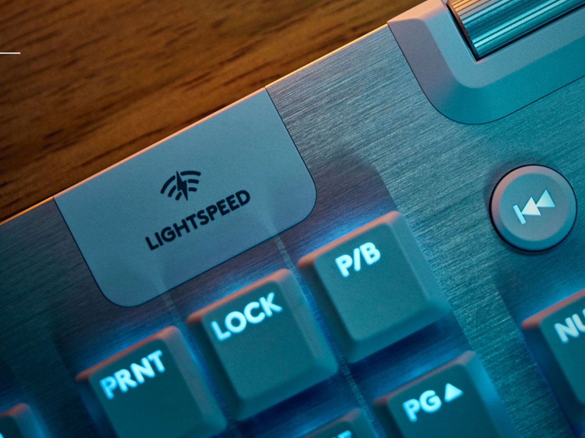 Die G915 X LIGHTSPEED Tastatur, nur 23 mm hoch, übertrifft die üblichen Konstruktionsstandards. Dank präziser Verarbeitung kombiniert sie Haltbarkeit mit einem ultradünnen Design und bietet gleichzeitig maximalen Komfort und elegantes Design. Die obere Platte aus hochwertigem gebürstetem Aluminium und doppelte PBT-Tastenkappen sorgen für ein reibungsloseres Arbeiten, schnellere Reaktionen und präzises Tippen, ohne auf Haltbarkeit zu verzichten.