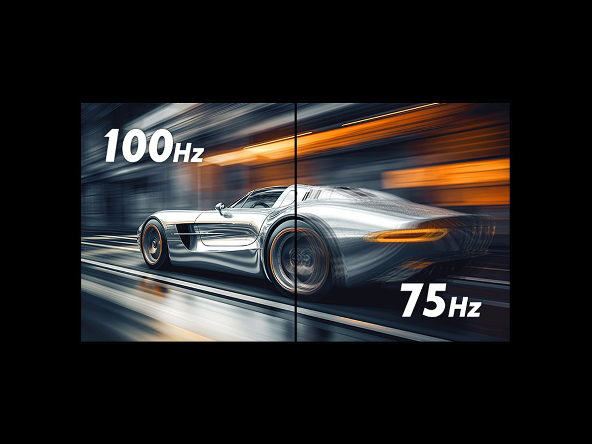 Die Bildwiederholfrequenz von 100 Hz sorgt für eine bessere Bildflüssigkeit. Das Bildflimmern wird reduziert und die Augenbelastung ist ebenfalls weniger spürbar. Eine erhöhte Frequenz bedeutet auch sanftere Übergänge zwischen kontrastreichen Farben, flüssigere Bewegungsszenen sowohl in Filmen als auch in Spielen und sogar ein reduziertes Flimmern des Mauszeigers.