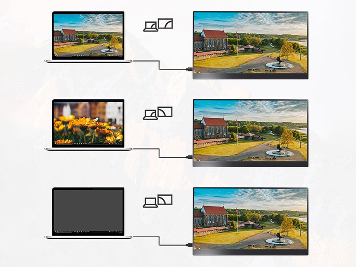 Das Modell A1 M bietet drei Anzeigemodi, die sich perfekt für unterschiedliche Situationen eignen. Im Duplicate-Modus kannst du das Bild von deinem Laptop auf einen größeren Bildschirm spiegeln. Der Extend-Modus erweitert deinen Desktop auf den tragbaren Monitor und schafft mehr Platz für die Arbeit. Im Second Screen Mode kannst du den A1 M als unabhängigen zweiten Bildschirm nutzen.
