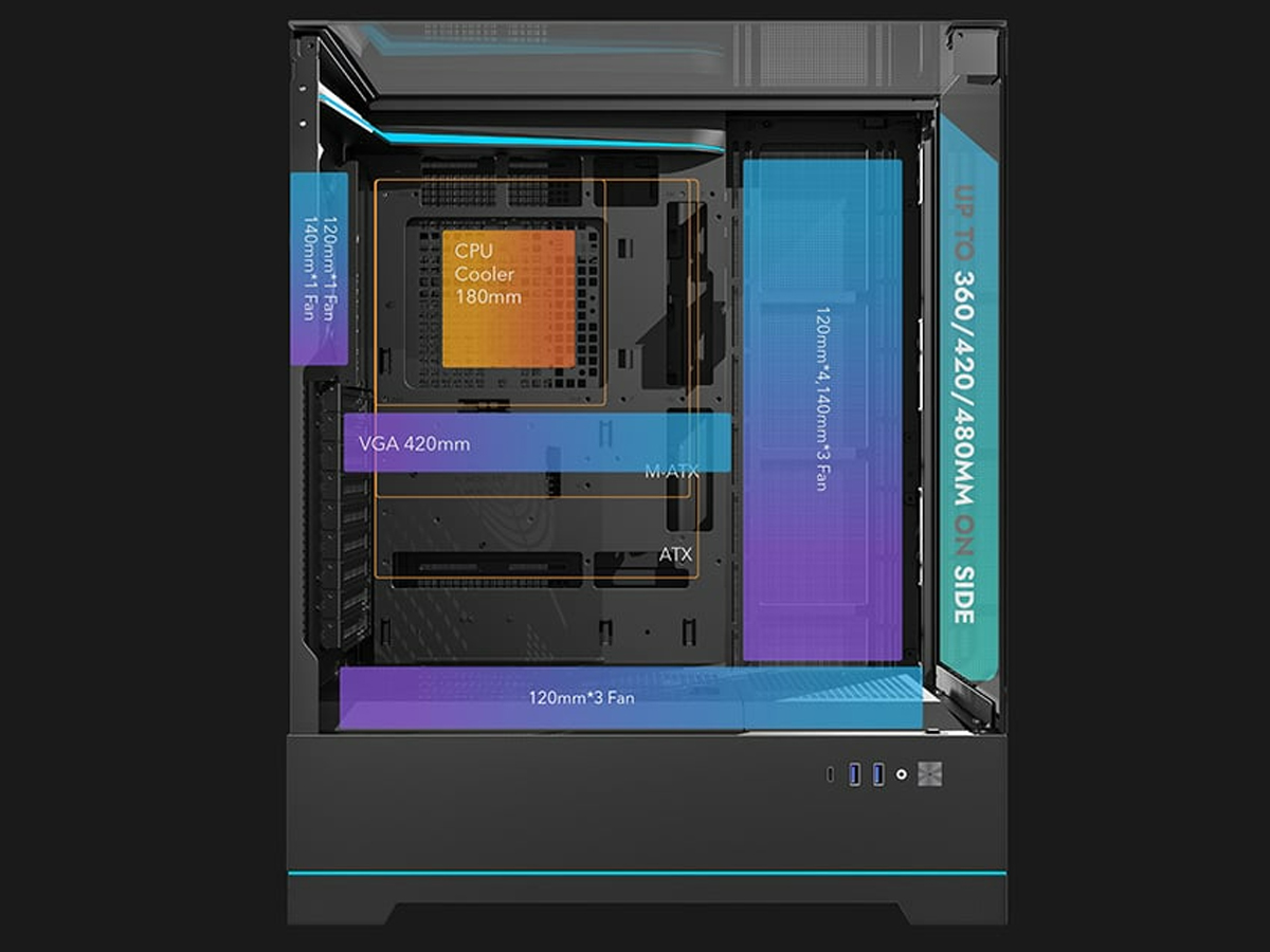 Das DY450L PRO unterstützt die Montage von bis zu 8 Lüftern und Wasserkühlungen mit einer Länge von bis zu 480 mm, was eine außergewöhnliche Leistung auch bei intensiver Arbeit gewährleistet. Das Gehäuse bietet Platz für Grafikkarten mit einer Länge von bis zu 420 mm und CPU-Kühler mit einer Höhe von bis zu 180 mm, was es für umfangreiche Gaming-Konfigurationen geeignet macht.