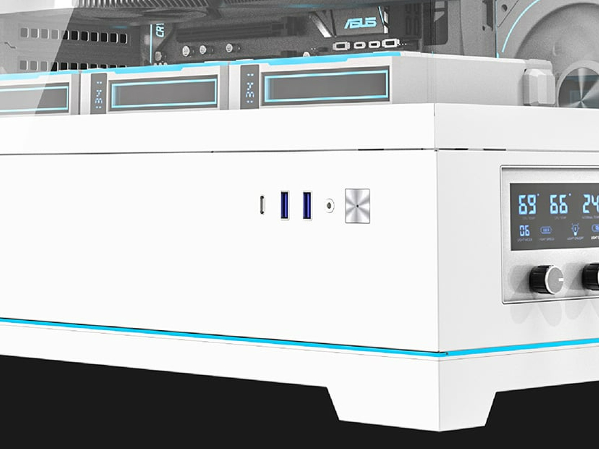 Das Darkflash DY451 PRO ist mit einem digitalen Temperaturmanagementsystem ausgestattet, das die Überwachung der GPU-, CPU- und Gehäusetemperatur in Echtzeit ermöglicht. Ein Bedienfeld mit Drehreglern an der Vorderseite ermöglicht eine präzise Steuerung der Lüftergeschwindigkeit, um die Kühlung optimal an die Systembelastung anzupassen. Für die volle Funktionalität des Displays ist der Download eines Treibers von der Herstellerseite erforderlich.