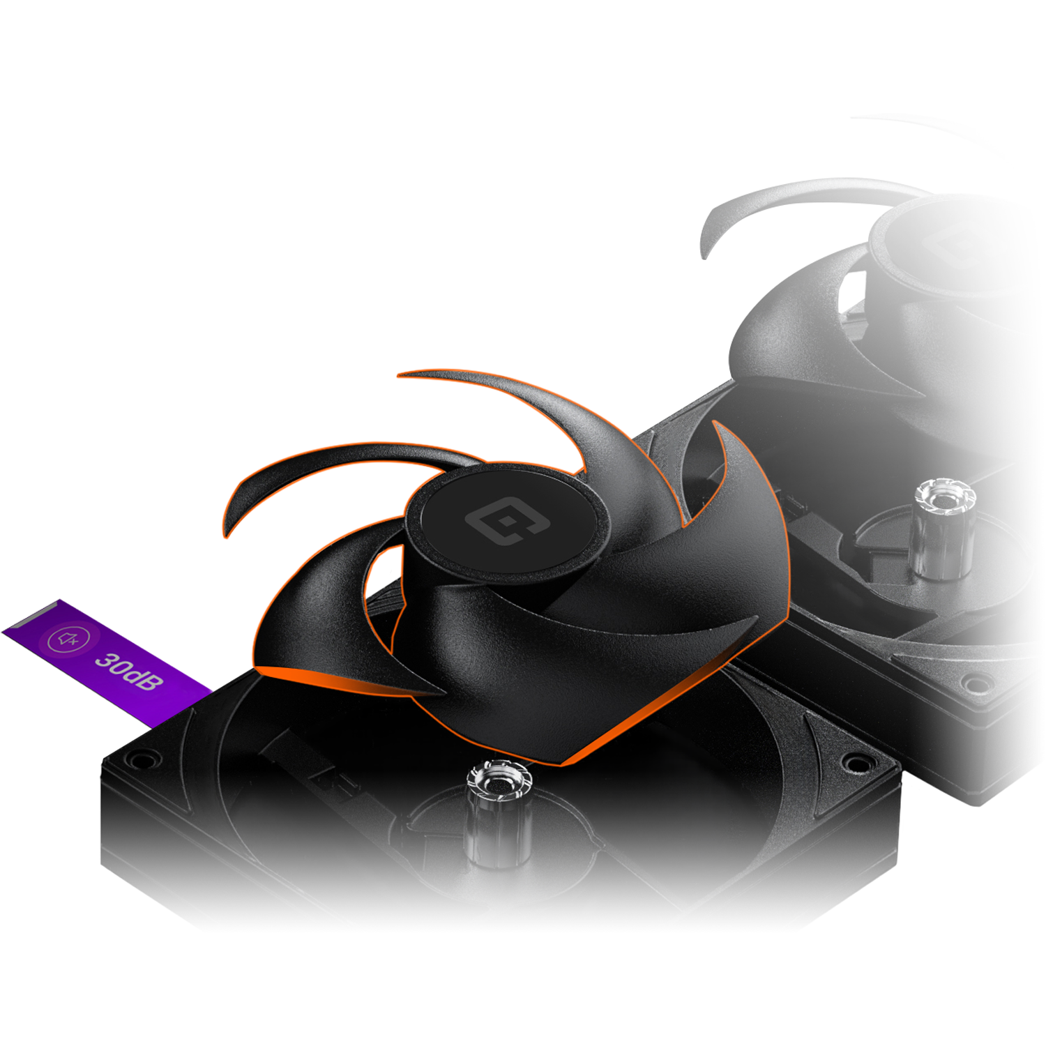 Die neue Flügelgestaltung des Lüfters ermöglicht eine effiziente Luftzirkulation bei maximaler Lautstärke von nur 30 dB bei 2000 U/min. Das hydraulische Lager mit hoher Lebensdauer sorgt für einen langen, zuverlässigen und stabilen Betrieb.