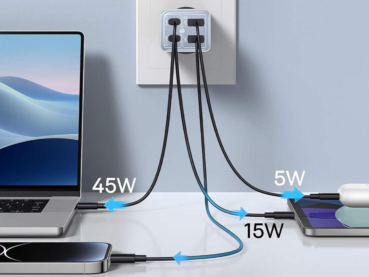 Mit vier Anschlüssen ermöglicht das Baseus GaN6 Pro das gleichzeitige Laden von Laptop, Smartphone und Tablet. Es unterstützt viele Schnellladestandards, was ein blitzschnelles Aufladen ermöglicht. Sie können problemlos ein MacBook, iPhone, Samsung Galaxy, Google Pixel oder Nintendo Switch aufladen. Jeder Anschluss passt die Leistung automatisch an das angeschlossene Gerät an. Es ist schnelles und bequemes Laden in jeder Situation.