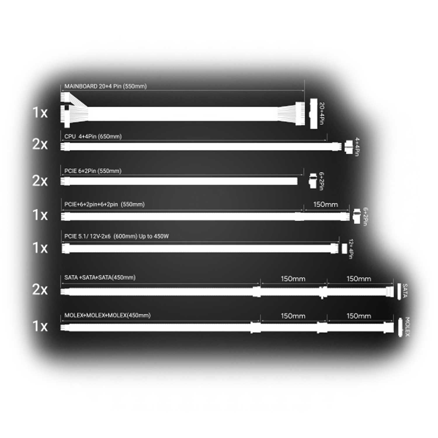 Die Kabellänge und verfügbaren Anschlüsse ermöglichen eine bequeme Verbindung zu einer breiten Palette von Computerkomponenten, einschließlich der leistungsstärksten Grafikkarten wie RTX 5090. Vollständig modulare Kabel erleichtern die Montage und Demontage des Netzteils sowie die Kabelorganisation im Gehäuse, was die Ästhetik und Ordnung im Inneren des Computers verbessert.