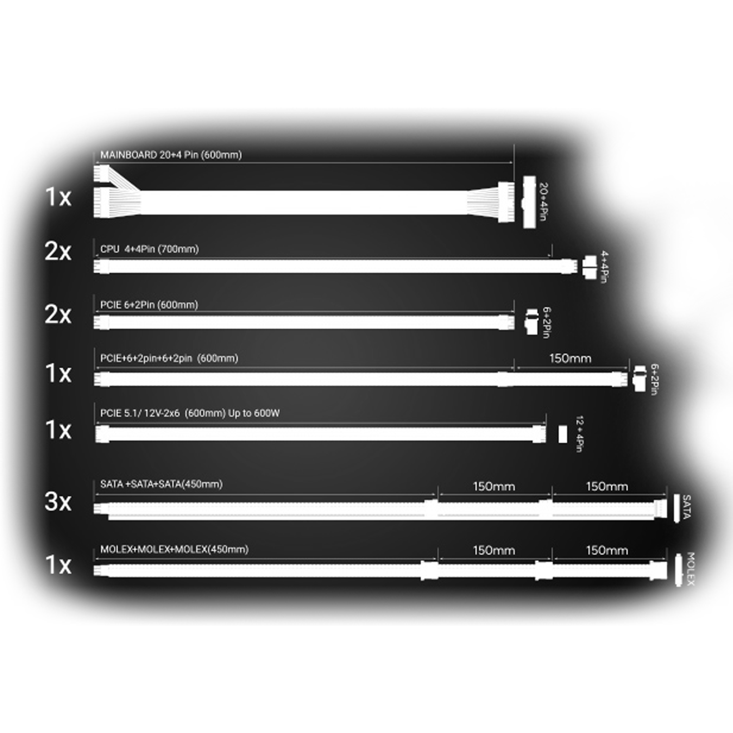Die Kabellänge und die verfügbaren Anschlüsse ermöglichen eine bequeme Verbindung zu einer breiten Palette von Computerkomponenten, einschließlich der leistungsstärksten Grafikkarten wie RTX 5090. Vollständig modulare Kabel erleichtern die Montage und Demontage des Netzteils sowie die Kabelorganisation im Gehäuse, was die Ästhetik und Ordnung im Inneren des Computers verbessert.