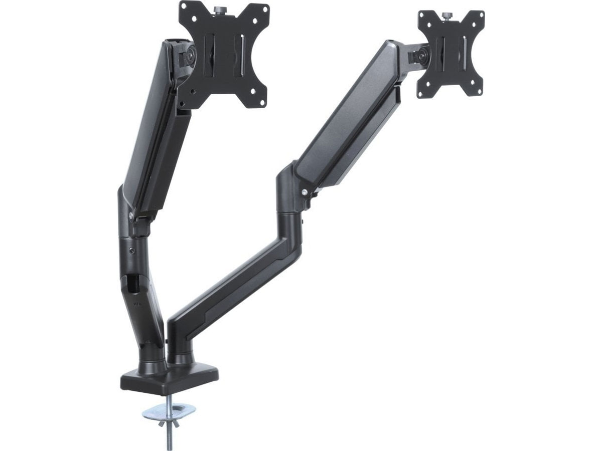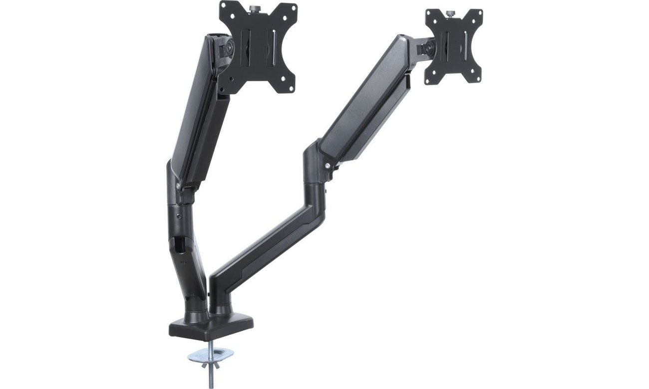 Dank der Gasdruckfeder kannst du die Position der Monitore mit einem Finger verändern – für maximale Bewegungsfreiheit. Die Halterung erlaubt das Anpassen der Höhe sowie das Drehen der Bildschirme sowohl vertikal als auch horizontal – ganz nach deinen Wünschen. Du kannst sie am Rand des Schreibtischs oder durch eine Bohrung in der Platte befestigen – maximale Flexibilität bei der Einrichtung. Das klassische Design mit Pulverbeschichtung passt perfekt in jedes Umfeld.
