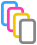 Ansicht der Vorderseite des iPad mit aktiviertem Home-Bildschirm. Dahinter siehst du vier iPads in Blau, Pink, Gelb und Silber, die mit der Rückseite zu dir stehen.