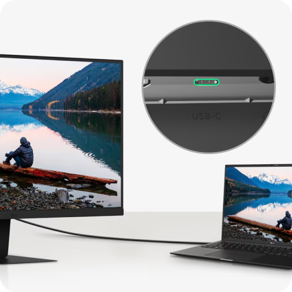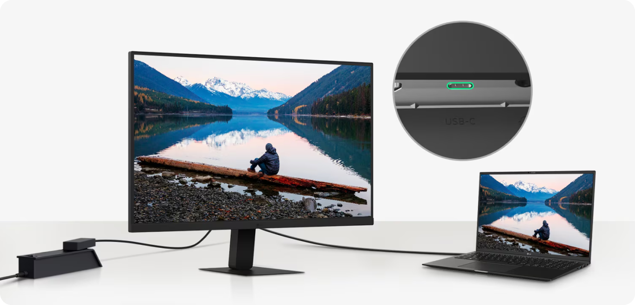 *Die Bilder sind eine Simulation, um die Funktionen besser zu verstehen und können von den tatsächlichen Nutzererfahrungen abweichen. **Für den ordnungsgemäßen Betrieb ist ein USB-C-Kabel erforderlich, um den USB-C-Port mit dem Monitor zu verbinden. Das Kabel ist nicht im Lieferumfang enthalten (separat erhältlich).
