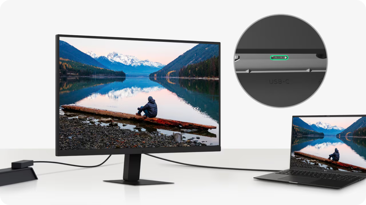 Verbinde deinen Laptop mit dem Monitor über ein USB-C-Kabel**, um bis zu 15 W Leistung und Display-Verbindung zu erhalten.