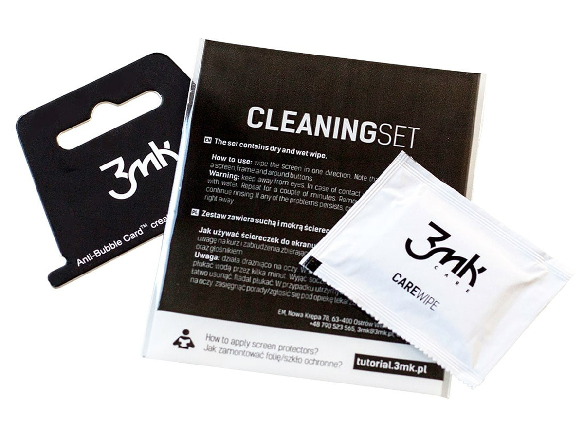 Die spezielle Klebstoffsubstanz Inviscid-Sil verhindert die Bildung von Luftblasen und erleichtert deren Entfernung während der Installation des 3mk HardGlass Max Lite. Im Lieferumfang sind neben dem gehärteten Glas auch Montagezubehör enthalten: eine Anti-Bubble-Karte, ein trockenes Tuch und ein feuchtes Tuch.