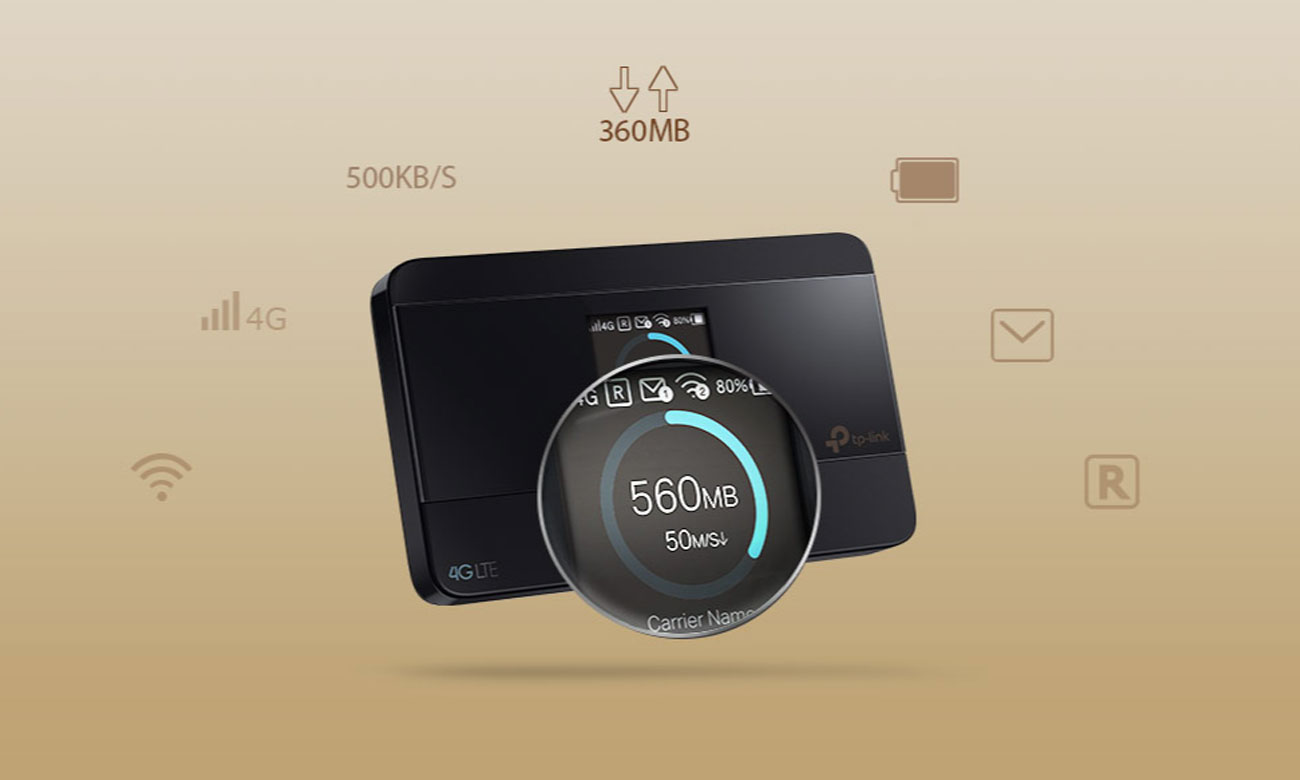 Das TP-Link M7350 ermöglicht es dir, deine 4G-Verbindung einfach zu teilen. Stecke einfach eine SIM-Karte in das Gerät, um sofort einen Internet-Hotspot mit zwei wählbaren Bändern zu erstellen. Der M7350 ermöglicht ein einfaches Teilen der 4G-Verbindung mit einer Download-Geschwindigkeit von bis zu 150 Mb/s und einer Upload-Geschwindigkeit von bis zu 50 Mb/s, sogar für bis zu 10 Benutzer gleichzeitig. Aufgrund seiner geringen Größe und des leistungsstarken, integrierten Akkus ist es der ideale Reisebegleiter, der es dir ermöglicht, bis zu 8 Stunden lang das Internet zu nutzen. Das moderne TFT-Display ermöglicht es dir, Informationen über den Betrieb des Geräts wie Signalstärke, Netzwerktyp (4G/3G/2G), den Status des drahtlosen Netzwerks, die Internetverbindung, den Batteriestatus und andere Nachrichten leicht zu überprüfen.