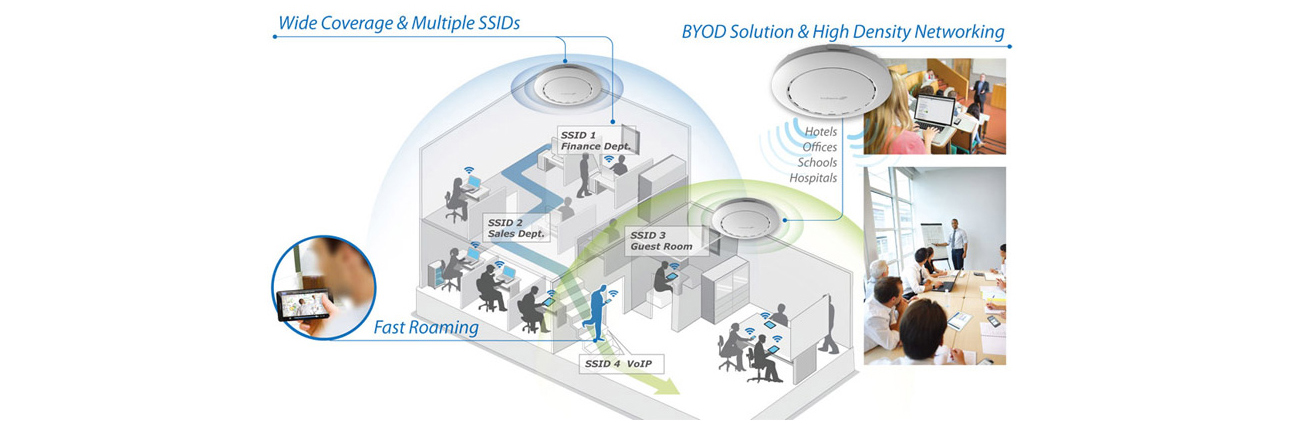 CAP300 ist kompatibel mit dem Standard 802.11n. Die Datenübertragung kann beim Einsatz von 802.11n eine Geschwindigkeit von bis zu 300 Mb/s erreichen. Die Kompatibilität mit dem 802.11n-Standard ermöglicht eine Erweiterung der Reichweite des drahtlosen Netzwerks und reduziert die Anzahl der "toten Punkte". CAP300 ist mit Hochleistungsantennen ausgestattet und bietet zusammen mit der Möglichkeit, die Sendeleistung zu regulieren, eine größere Reichweite des drahtlosen Netzwerks. Dies, zusammen mit einer hohen Empfindlichkeit, ermöglicht eine stabile drahtlose Verbindung. Außerdem unterstützt CAP300 bis zu 16 separate drahtlose Netzwerke.