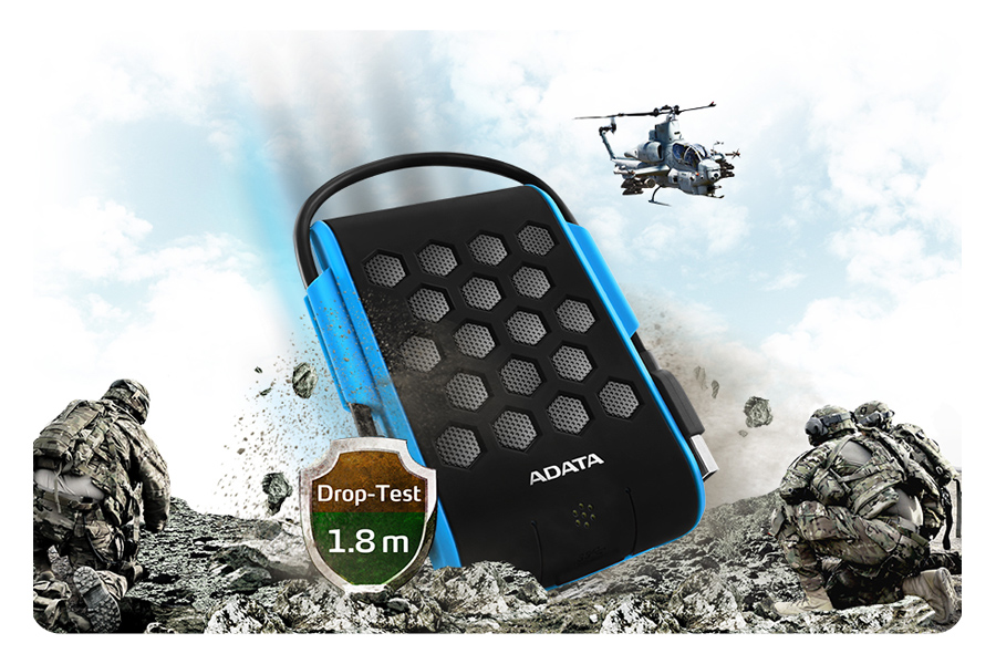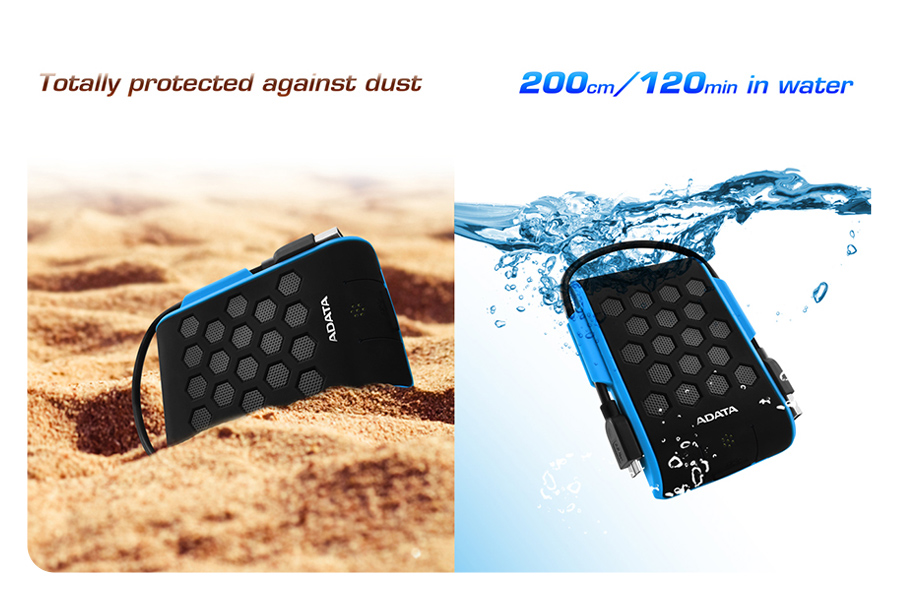 Die HD720 hat den strengen IP68 Test bestanden und bietet somit einen hervorragenden Schutz vor Wasser und Staub. Mit der widerstandsfähigen Konstruktion funktioniert die HD720 normalerweise selbst in einer staubigen Umgebung oder nachdem sie im Speicherzustand bis zu 2 Minuten in metertiefes Wasser getaucht war. Die HD720 hat sogar die strikteren Stoßfestigkeitstests bis zu einer Höhe von 1,8m absolviert, damit wurde sie sogar härter getestet als das die US-Militärnorm (MIL-STD-810G 516,6) verlangt. Die Festplatte hält plötzlichen Aufprall und Stürze sehr gut aus.