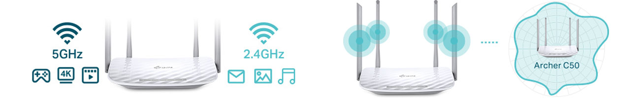 Der Archer C50 Router sendet zwei separate drahtlose Netzwerke in den Bändern 2,4 GHz und 5 GHz aus und bietet eine sehr hohe Leistung drahtloser Verbindungen. Dies ermöglicht die gleichzeitige Nutzung von zwei dedizierten drahtlosen Netzwerken - mit Geschwindigkeiten, die selbst für die anspruchsvollsten Anwendungen geeignet sind. Dadurch können Sie tägliche, weniger anspruchsvolle Anwendungen wie E-Mail und Web-Browsing über das 2,4-GHz-Band nutzen, während Sie gleichzeitig das 5-GHz-Band für anspruchsvollere, verzögerungsempfindliche Anwendungen wie HD-Video-Streaming oder Online-Spiele verwenden.